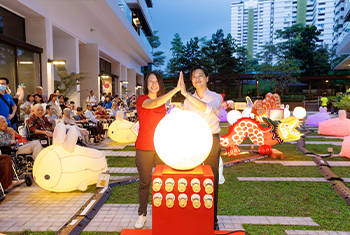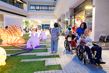 As evening fell, the highlight of the event unfolded with a Mid-Autumn light-up officiated by Mr Kwek and Ms Choo, followed by a lantern walk around the courtyard. The soft glow of lanterns lit up the night, bringing delight and hope to the patients.