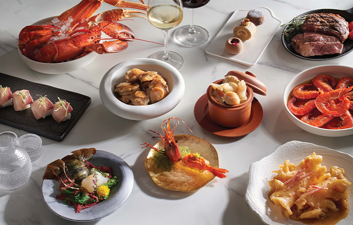 Feast on international offerings such as the exclusive Omakase creation, Wagyu steak, and Baked King Prawns with Herb Butter.