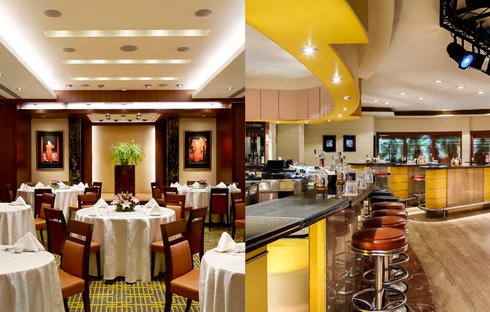 Since 1989, Tien Court (left) has captivated diners with its oriental charm, exceptional service, and commitment to culinary excellence, where diners will experience the essence of authentic Teochew cuisine. Connections Lounge (right) is the perfect bar for work gatherings and social meetups with electrifying live music performances to accompany your drinks.