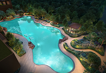The 2nd storey landscape deck seamlessly integrates lifestyle facilities with contemporary architecture, English-inspired design, and lush greenery, featuring a swimming pool, clubhouse, and BBQ terraces.